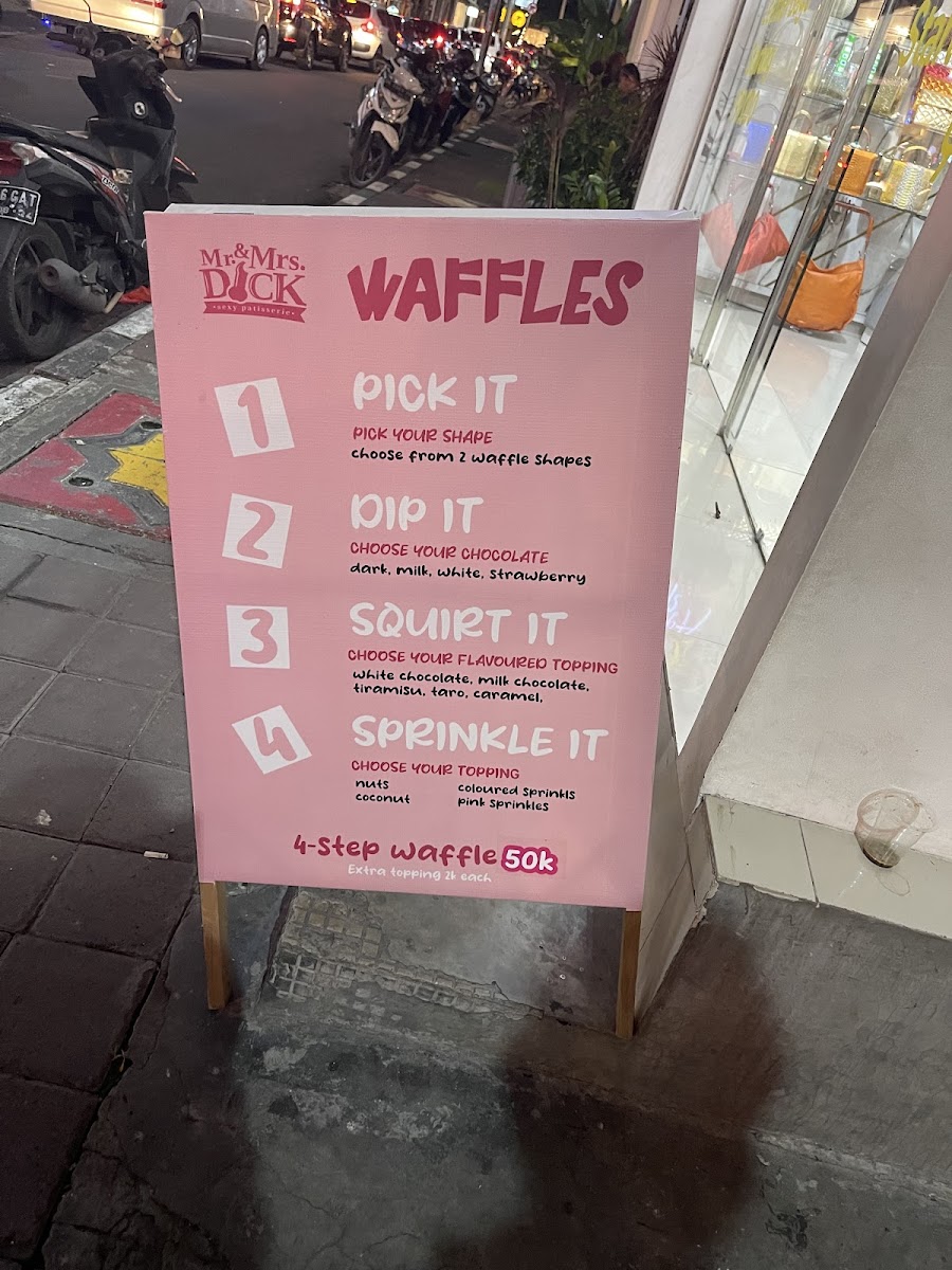 Mr & Mrs Dick, located in vibrant Seminyak, Bali, offers a playful twist on the traditional waffle experience. This distinctive eatery is known for its cheekily shaped waffles that not only deliver a hearty laugh but also pack a flavorful punch. While some customers note that the waffles are pre-prepared, their delightful taste overshadows this minor detail. With cheerful service and a fun atmosphere, the spot becomes an unforgettable destination for both locals and tourists. Whether celebrating a special occasion or simply indulging in a sweet treat, Mr & Mrs Dick guarantees a deliciously whimsical outing.